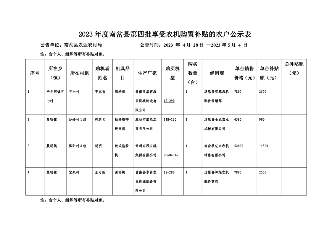 2023年度南岔县第四批享受农机购置补贴的农户公示