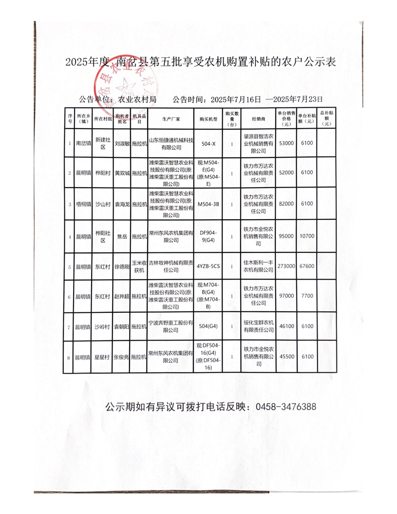 2025年南岔县第五批享受农机购置补贴的农户公示