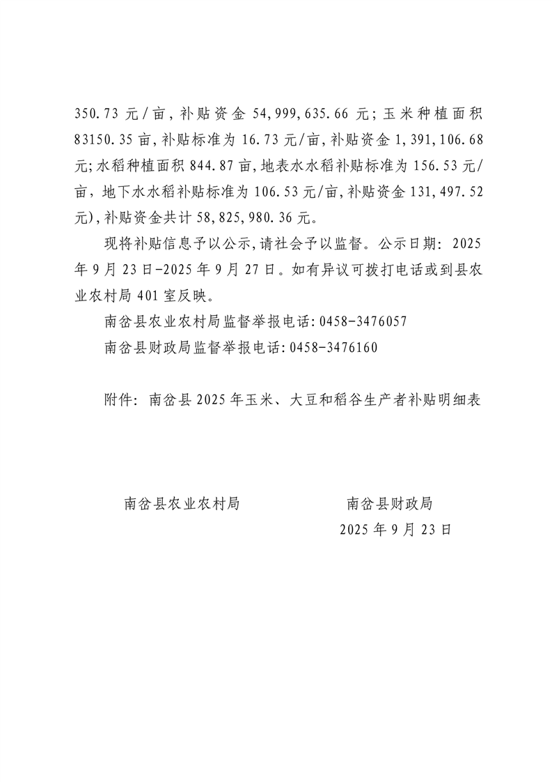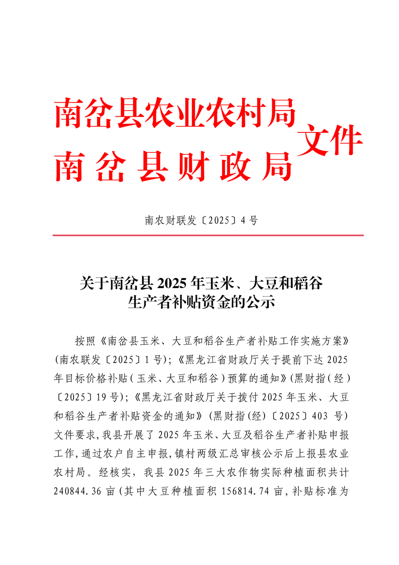 关于南岔县2025年玉米、大豆和稻谷生产者补贴资金的公示