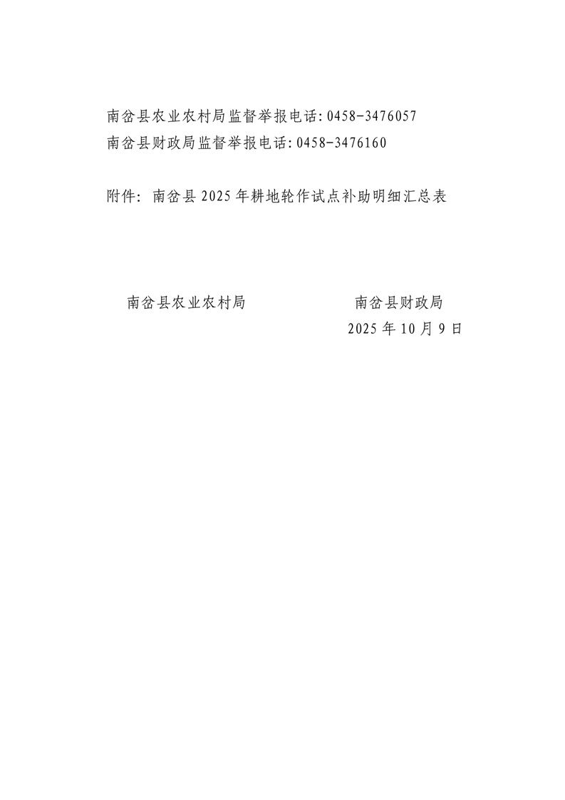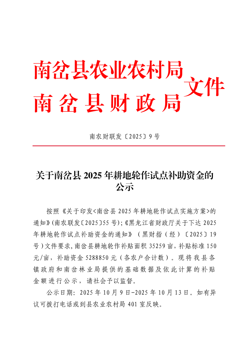 关于南岔县2025年耕地轮作试点补助资金的公示