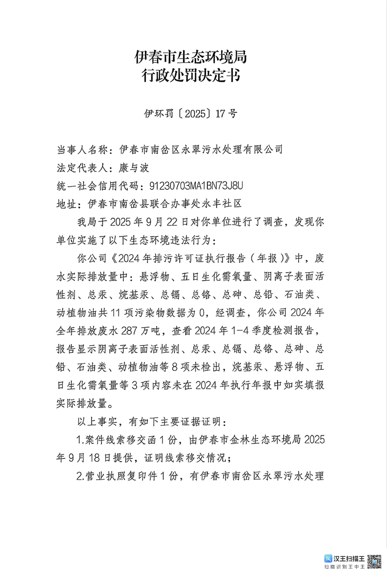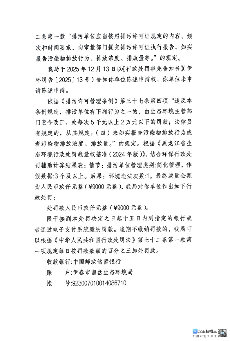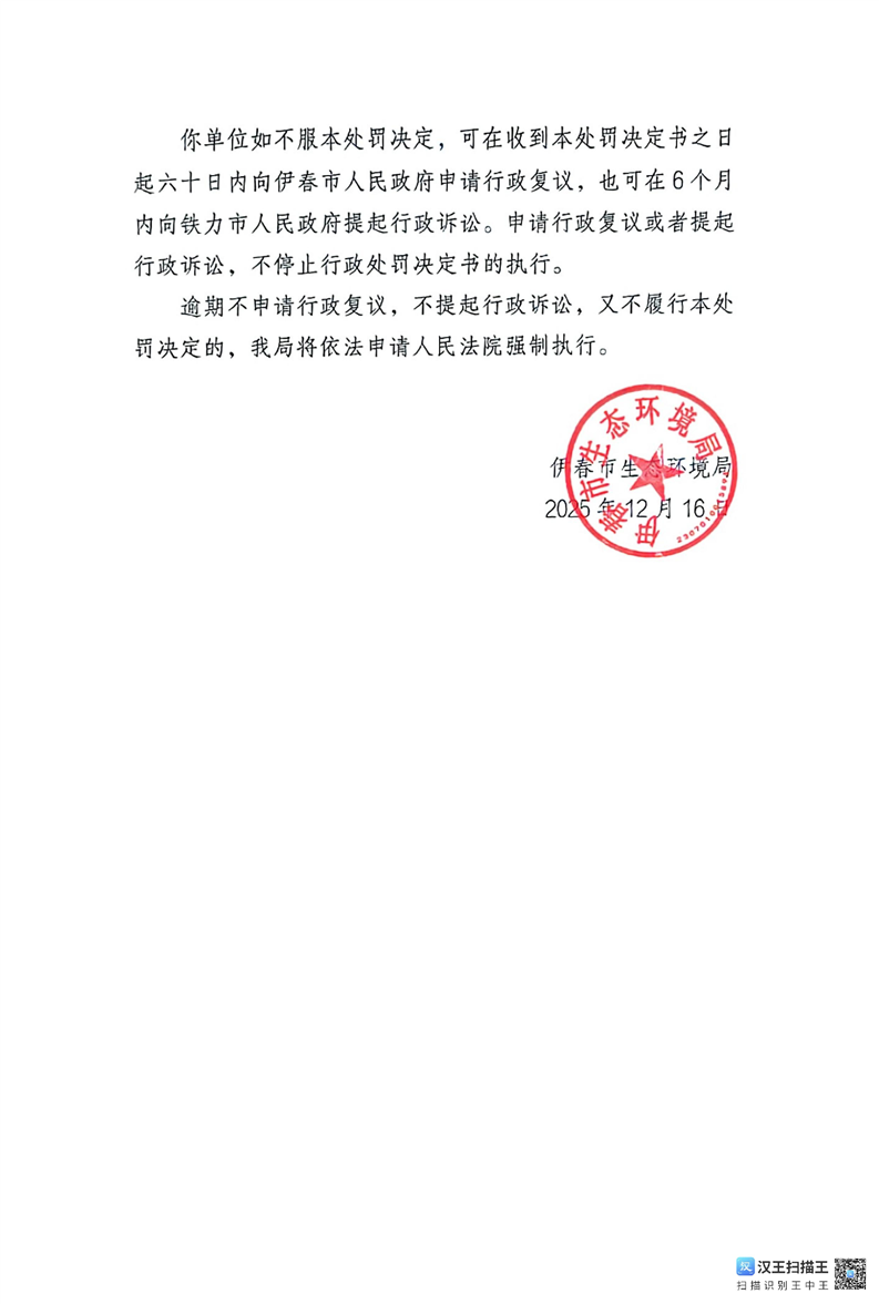 伊春市生态环境局行政处罚决定书(伊环罚(2025)17号)