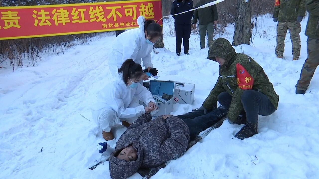 演练设定为南岔林业局公司林场作业区附近出现野生东北虎袭人事件,有部分人员受伤且东北虎仍在周边林木徘徊的紧急情况。接到报警后,森林公安派出所第一时间启动应急预案、通报相关单位,并组织人员赶赴现场,管控事发区域。县林业和草原局、南岔林业局公司派出专家采用声响、气味等非致命性驱离保护方式,引导东北虎远离人类活动区域。医护人员同步抵达,对模拟受伤群众开展伤口包扎、生命体征检查等紧急救治,并协助转运至定点医院进一步诊疗。