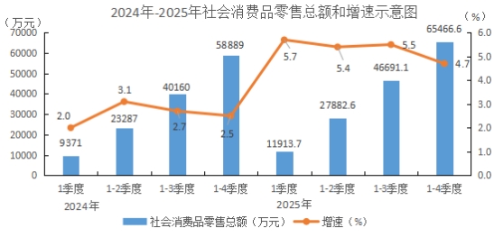 (三)消费市场稳健,增速温和增长。全年全县社会消费品零售总额65466.6万元,增长4.7%,高于全市(4.4%)平均水平0.3百分点,位于全市第6位。按行业分,批发业增长0.5%;零售业增长7.7%;住宿业增长7.9%;餐饮业增长4.1%。按地域分,乡村零售额13338.4万元,增长7.1%;城镇零售额52128.2万元,增长4.1%。