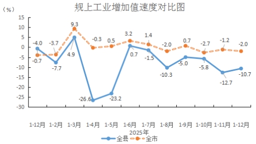 (二)规上工业产值平稳,增速低位运行。全县规上工业7家,规上工业增加值增速下降10.7%,降幅比1-11月收窄2.0个百分点,低于全市(-2.0%)平均水平8.7个百分点,位于全市第10位。规上工业总产值70661.69万元,增长1.2%。分行业看,医药行业产值38070.42万元,增长7.65%。食品加工行业实现产值290.00万元,下降88.2%;木材加工行业产值207.20万元,下降68.7%;非金属矿物制品业产值31421.78万元,增长7.3%;有机化学原料行业产值672.29万元,下降66.9%。