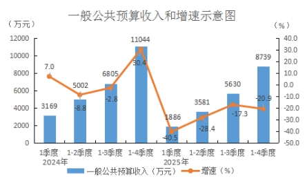 (五)财政收入下滑,同比降幅延续。全年我县一般公共预算收入8739万元,下降20.9%,位于全市第8位。其中,税收收入3595万元,增长6.5%;非税收收入5144万元,下降32.9%。