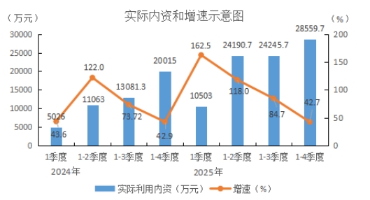 (六)内资增势延续,增速逐季放缓。全县实际利用内资在库项目34个,本年有到位资金的项目15个,其中本年新签约入库项目9个。实际利用内资额28559.7万元,增长42.7%,位于全市第6位。