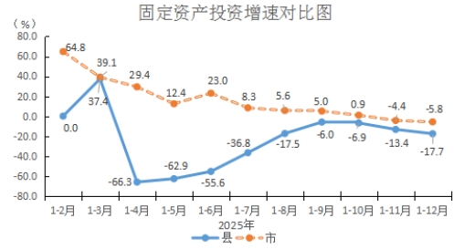 (四)固投首季飘红,负增态势趋缓。全年全县固定资产投资完成增速下降17.7%,低于全市(-5.8%)平均水平11.9个百分点,位于全市第9位。按产业分,第一产业投资与同期持平;第二产业投资完成额1079万元,下降67.4%。其中,制造业投资完成额1079万元,下降44.4%;第三产业投资完成额26097万元,下降12.1%。按建设性质分,新建投资完成额20586万元,下降33.7%;扩建完成额80万元;改建和技术改造完成额6510万元,增长267.4%。