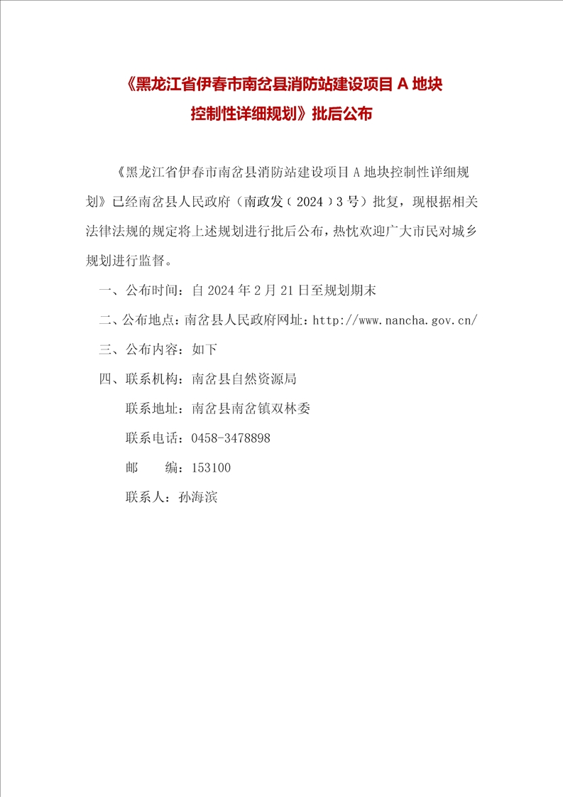 《黑龙江省伊春市南岔县消防站建设项目A地块控制性详细规划》批后公布