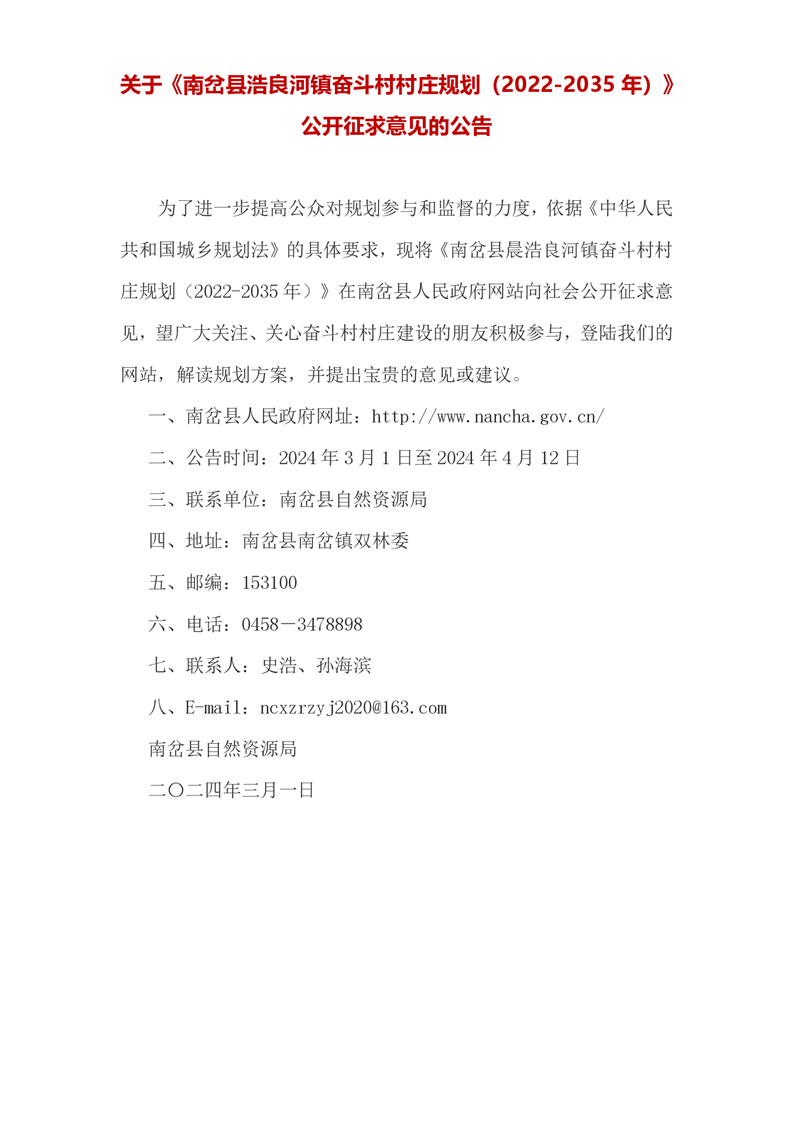 关于《南岔县浩良河镇奋斗村村庄规划(2022-2035年)》公开征求意见的公告