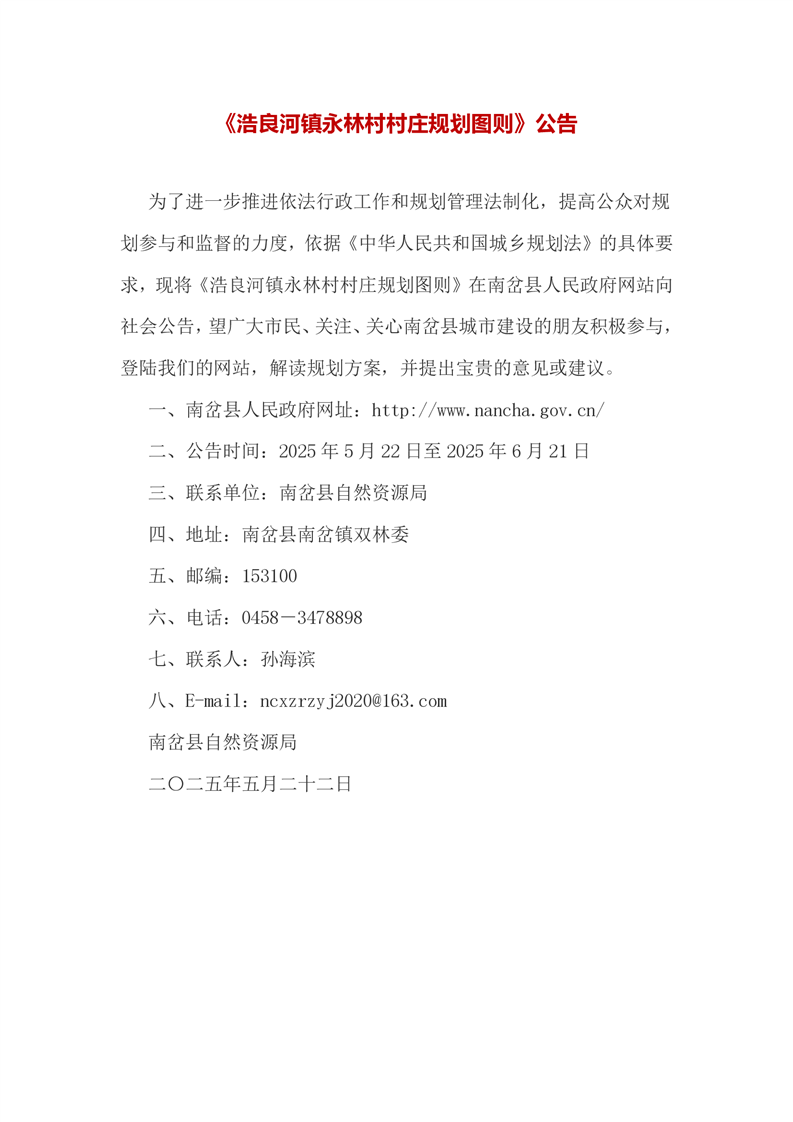 《浩良河镇永林村村庄规划图则》公告