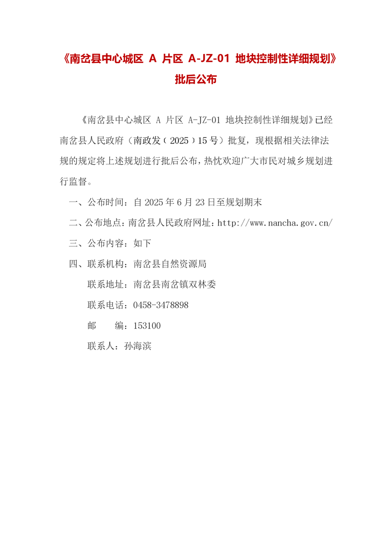 《南岔县中心城区 A 片区 A-JZ-01 地块控制性详细规划》批后公布