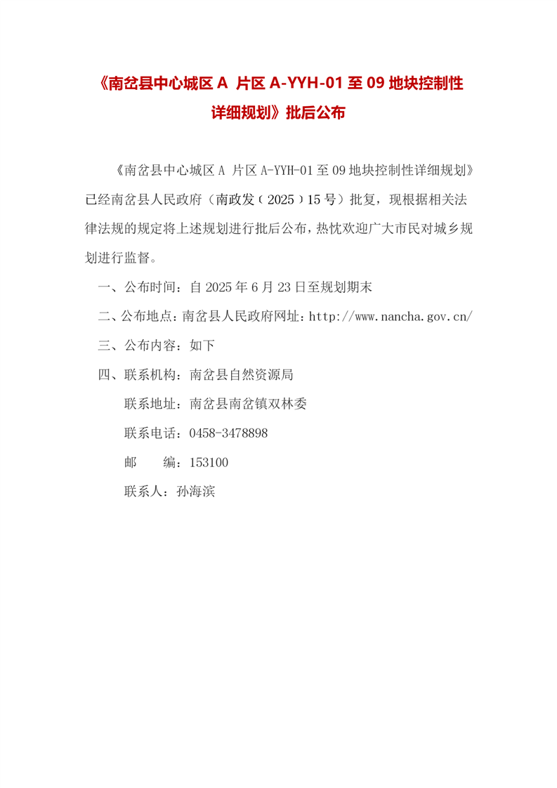 《南岔县中心城区 A 片区 A-YYH-01 至 09 地块控制性详细规划》批后公布
