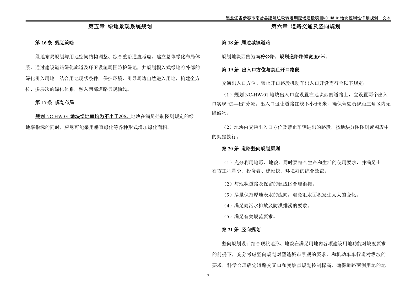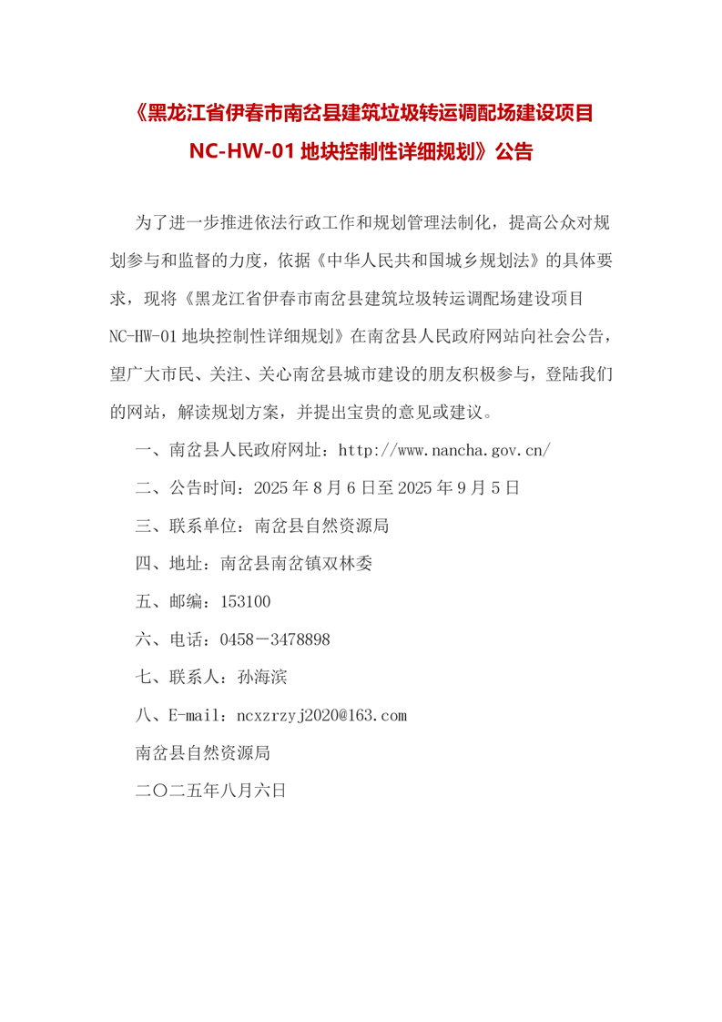 《黑龙江省伊春市南岔县建筑垃圾转运调配场建设项目NC-HW-01 地块控制性详细规划》公告